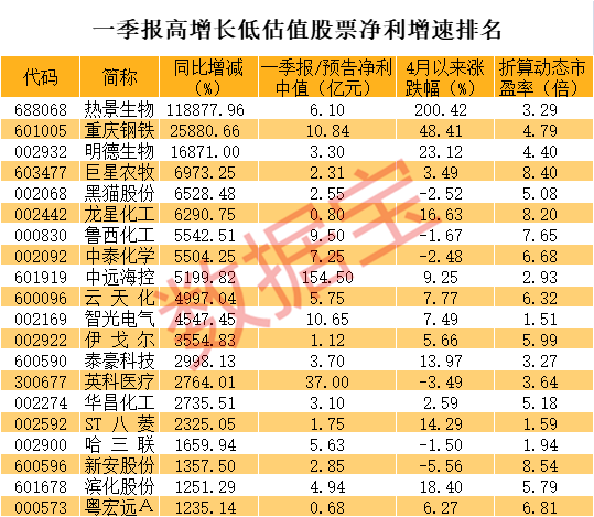 证券时报·数据宝统计,根据一季报或者一季报业绩预告净利中值,有79只个股一季报净利翻倍增长且折算动态市盈率低于10倍。其中,热景生物预计一季度净利润5.6亿元到6.6亿元,同比增加109125.67%到128630.25%。在此利好下,该股股价4月以来已涨超两倍。此外,重庆钢铁、明德生物、巨星农牧、黑猫股份、龙星化工、鲁西化工、中泰化学、中远海控等个股一季度净利均增超50倍,云天化、智光电气、伊戈尔、泰豪科技、英科医疗等个股一季度净利均增超10倍。