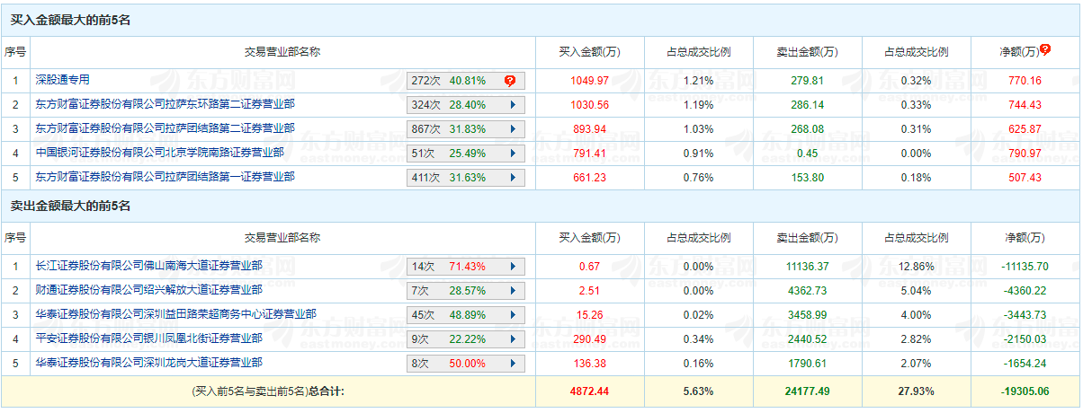 数据显示,该股前买五的席位上,东财拉萨三家营业部上榜,但买卖金额都不大。卖出榜则更具看点,长江证券股份有限公司佛山南海大道证券营业部大举卖出1.11亿元,而从该股公布的三日龙虎榜数据来看,这家营业部近3日曾大举买入近1.27亿元,这意味着,长江证券佛山南海大道割肉1600万。