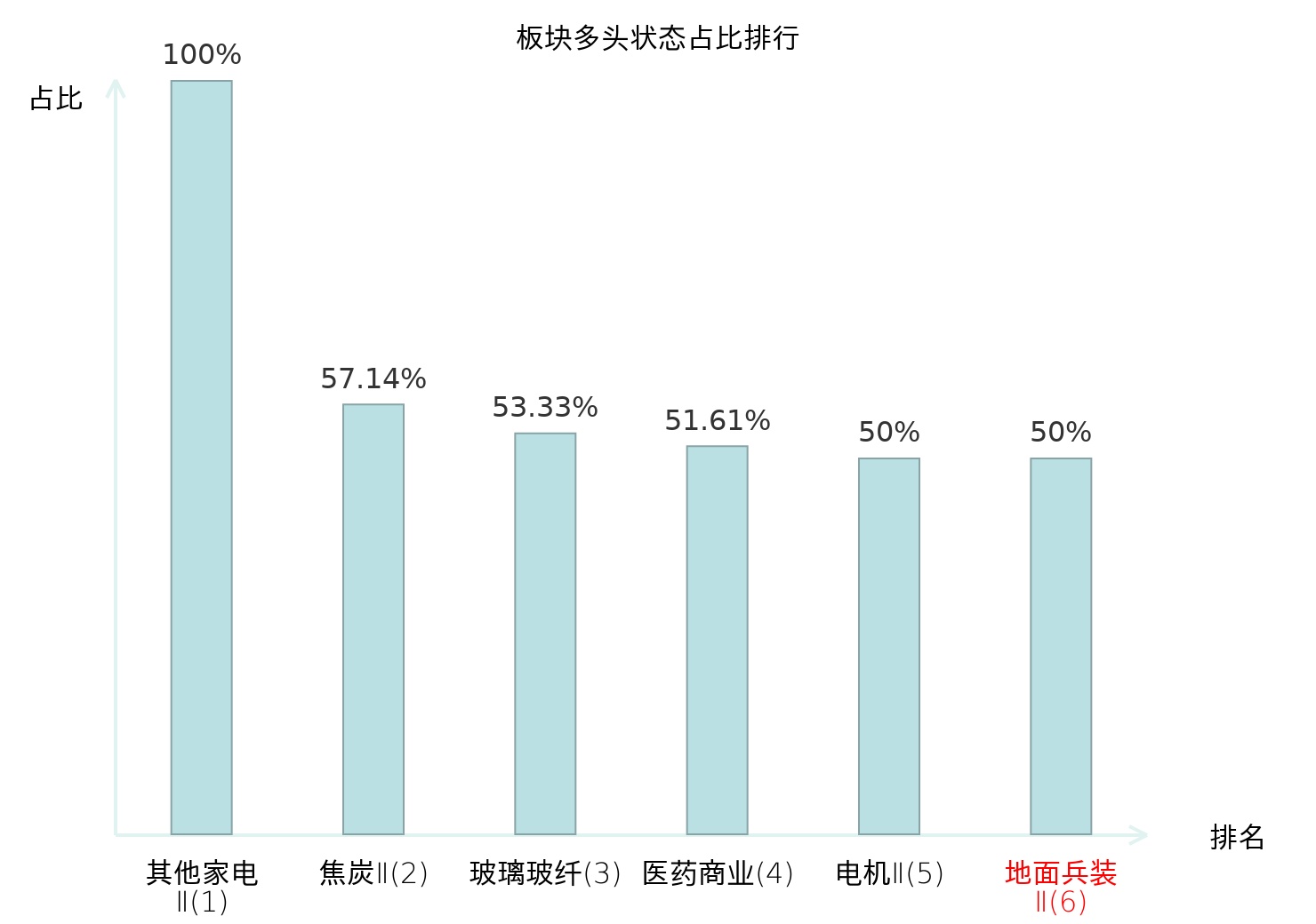 全市场所有行业板块中主力多头状态占比排名中,其他家电Ⅱ板块位居第一。白色家电板块名次提升最快,较昨日上升67位。