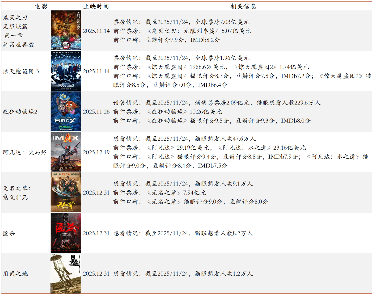 11-12月全球顶级IP影片集中登陆中国市场,形成年末票房冲刺行情。《鬼灭之刃:无限城篇》《惊天魔盗团3》《疯狂动物城2》《阿凡达3》等多部大IP进口影片将于1112月上映。由中国电影参与发行的日本动画电影《鬼灭之刃:无限城篇》于1114日在中国大陆上映,并登录IMAX影院,该片目前全球累计票房达7.02亿美元,是日本影史全球总票房冠军,中国大陆票房已达5.65亿元。该片粉丝众多,热度与评价都较高,口碑层面持续领跑,在IMDb评分为8.5分,豆瓣评分为8.7分,猫眼评分为9.7分。其前作《鬼灭之刃:无限列车篇》虽未在中国内地上映,但日本本土票房为407亿日元,收获豆瓣评分7.9分,展现出超高热度与较好口碑。