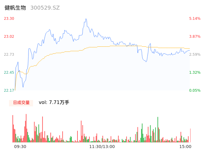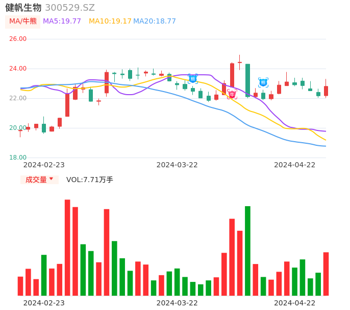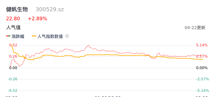 04月22日,健帆生物收报22.80,股价涨幅2.89%,成交金额1.76亿元,换手率1.48%。