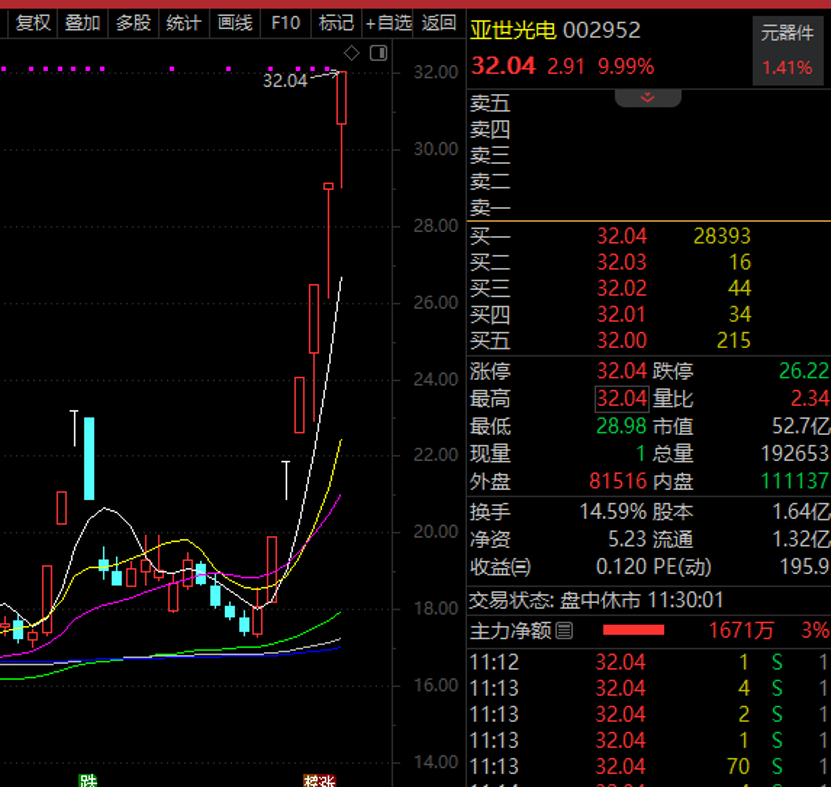 近期,较为强势的个股也多包含科技概念。领湃科技、亚世光电、通易航天等连续上涨,均属于较受关注的科技题材。其中,已经连续收获5个涨停板的亚世光电早盘再度涨停。