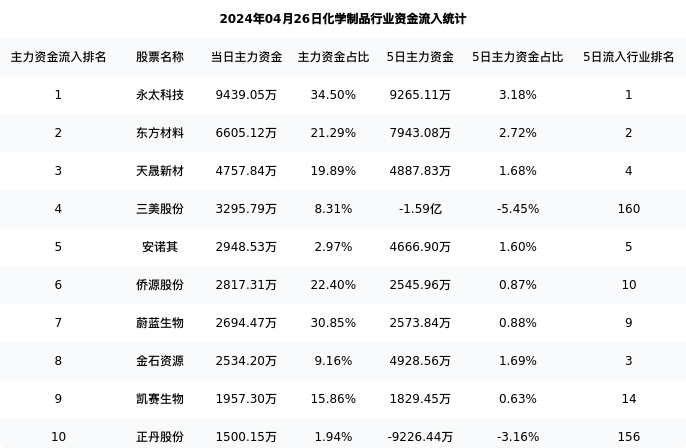 从主力资金流向来看,化学制品行业今日主力资金流入55.25亿元,在所有申万二级行业中排名:8/131。