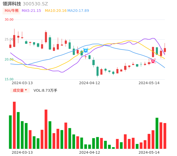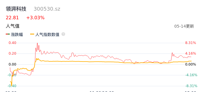 05月14日,领湃科技收报22.81,股价涨幅3.03%,成交金额1.97亿元,换手率5.52%。