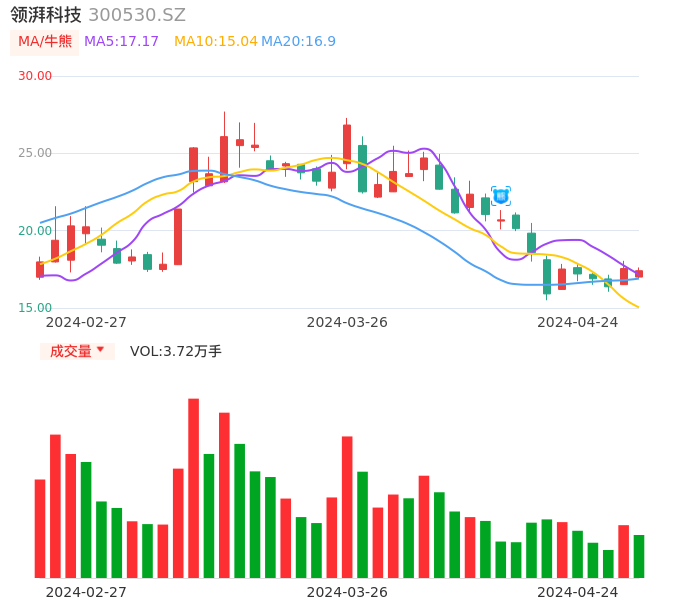 04月24日,领湃科技收报17.41,股价涨幅-0.80%,成交金额6430.85万元,换手率2.35%。
