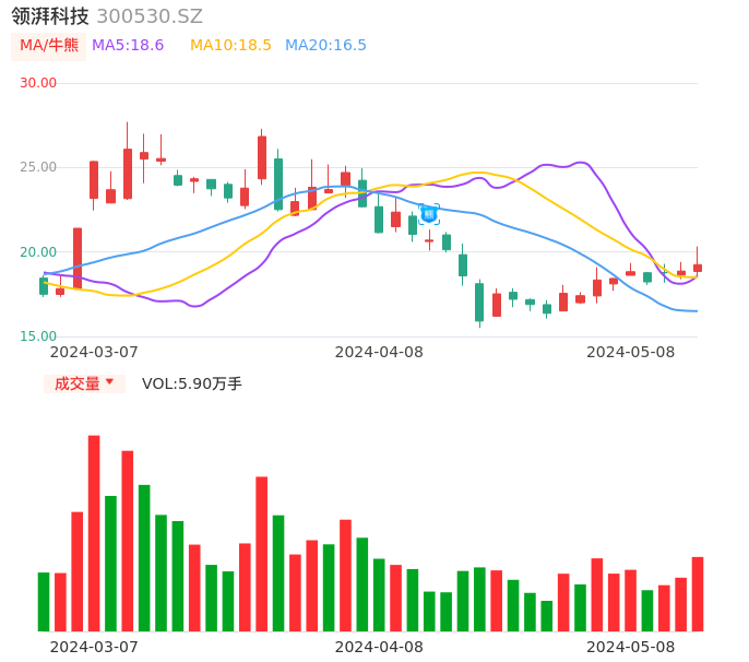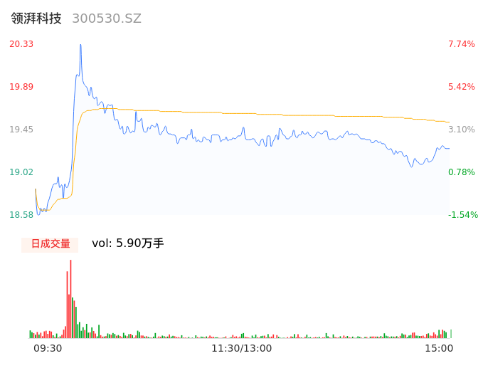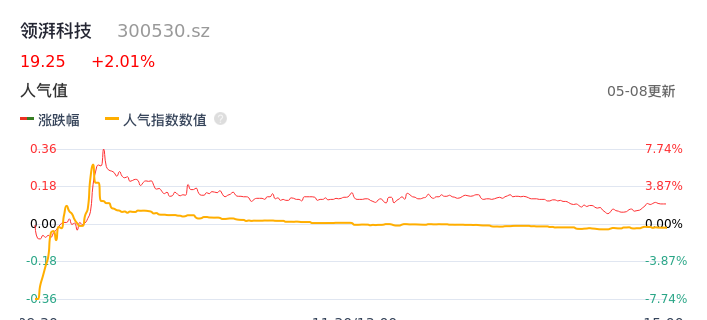 05月08日,领湃科技收报19.25,股价涨幅2.01%,成交金额1.15亿元,换手率3.73%。