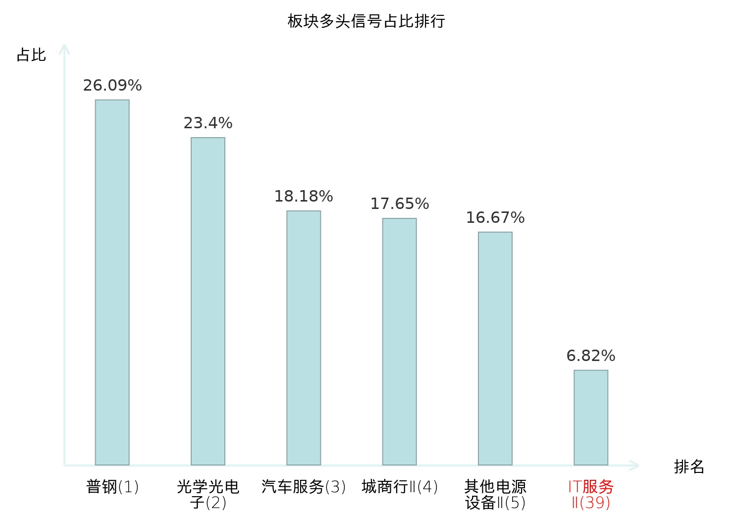 全市场所有行业板块中主力多头信号占比排名中,普钢板块位居第一。国有大型银行Ⅱ板块名次提升最快,较昨日上升116位。