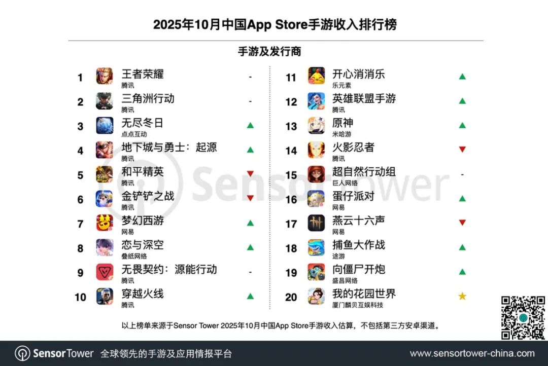 腾讯《王者荣耀》、《三角洲行动》稳居本期中国App Store手游收入榜冠亚军。