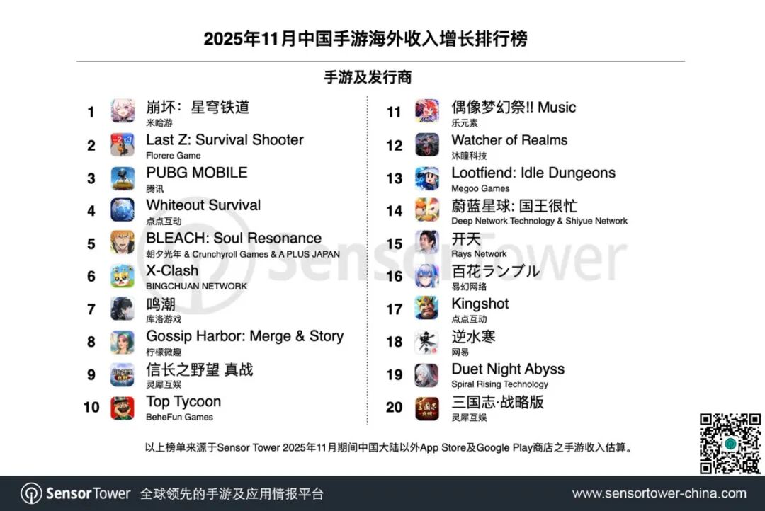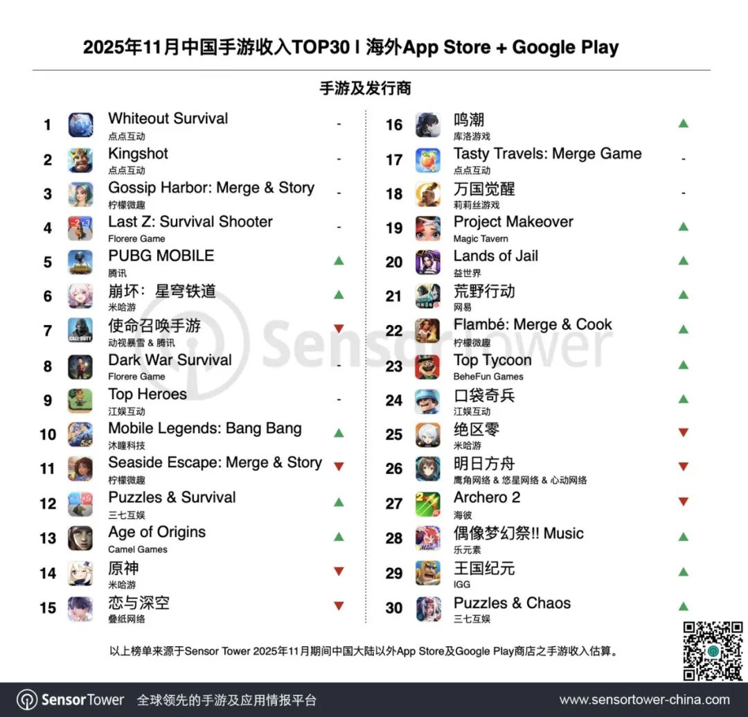 点点互动龙头产品《Whiteout Survival》和《Kingshot》继续强势包揽出海手游收入榜冠亚军。《Whiteout Survival》凭借10月末的万圣节活动、11月下旬的感恩节活动,以及期间的“霜龙暴君 Frostdragon Tyrant”联盟对抗活动,持续点燃全球玩家热情,稳稳锁定11月收入榜冠军席位。