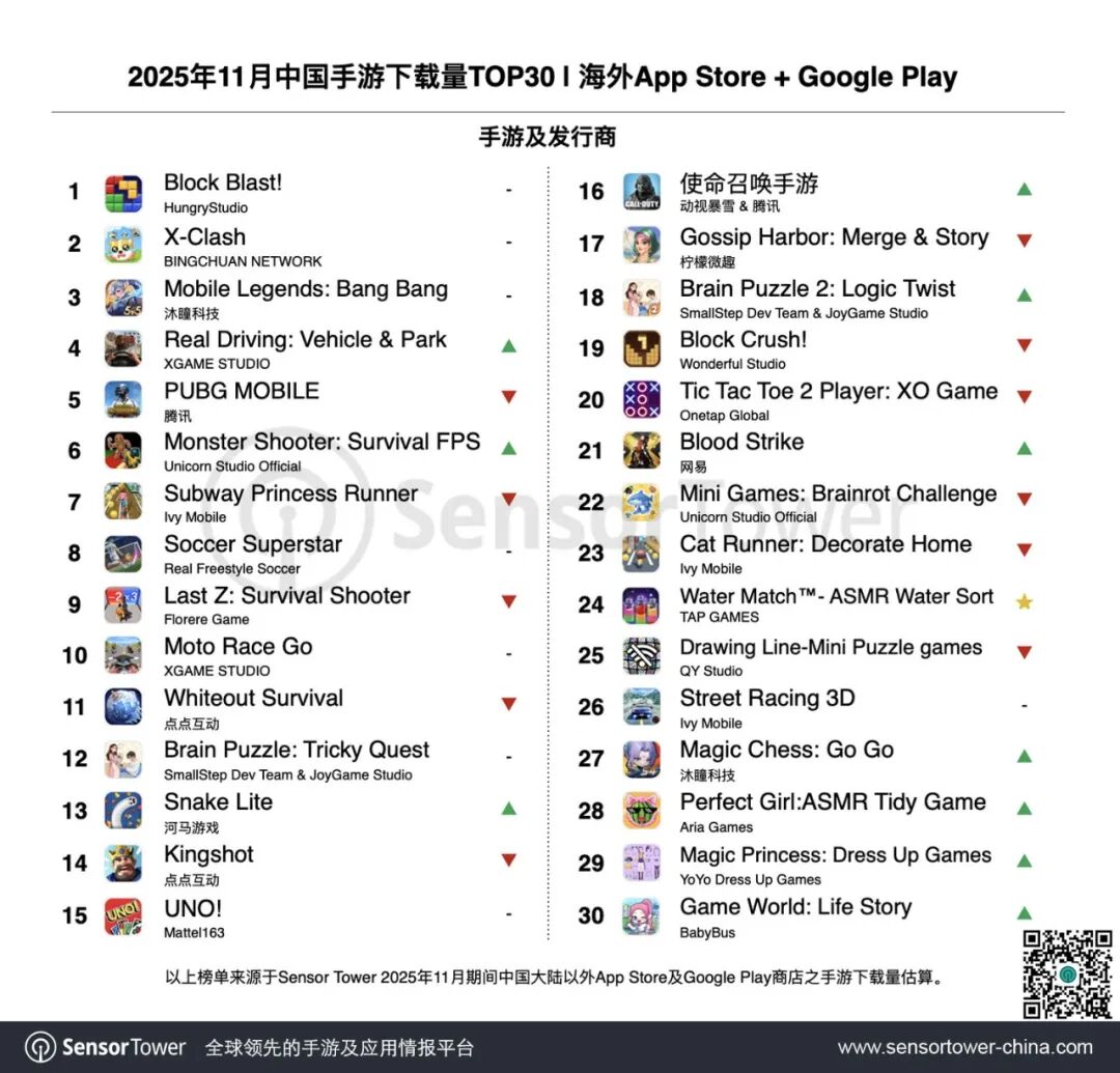 Hungry Studio消除手游《Block Blast!》11月下载量环比上涨4%,刷新上市以来最高纪录,稳居本月出海手游下载榜冠军。