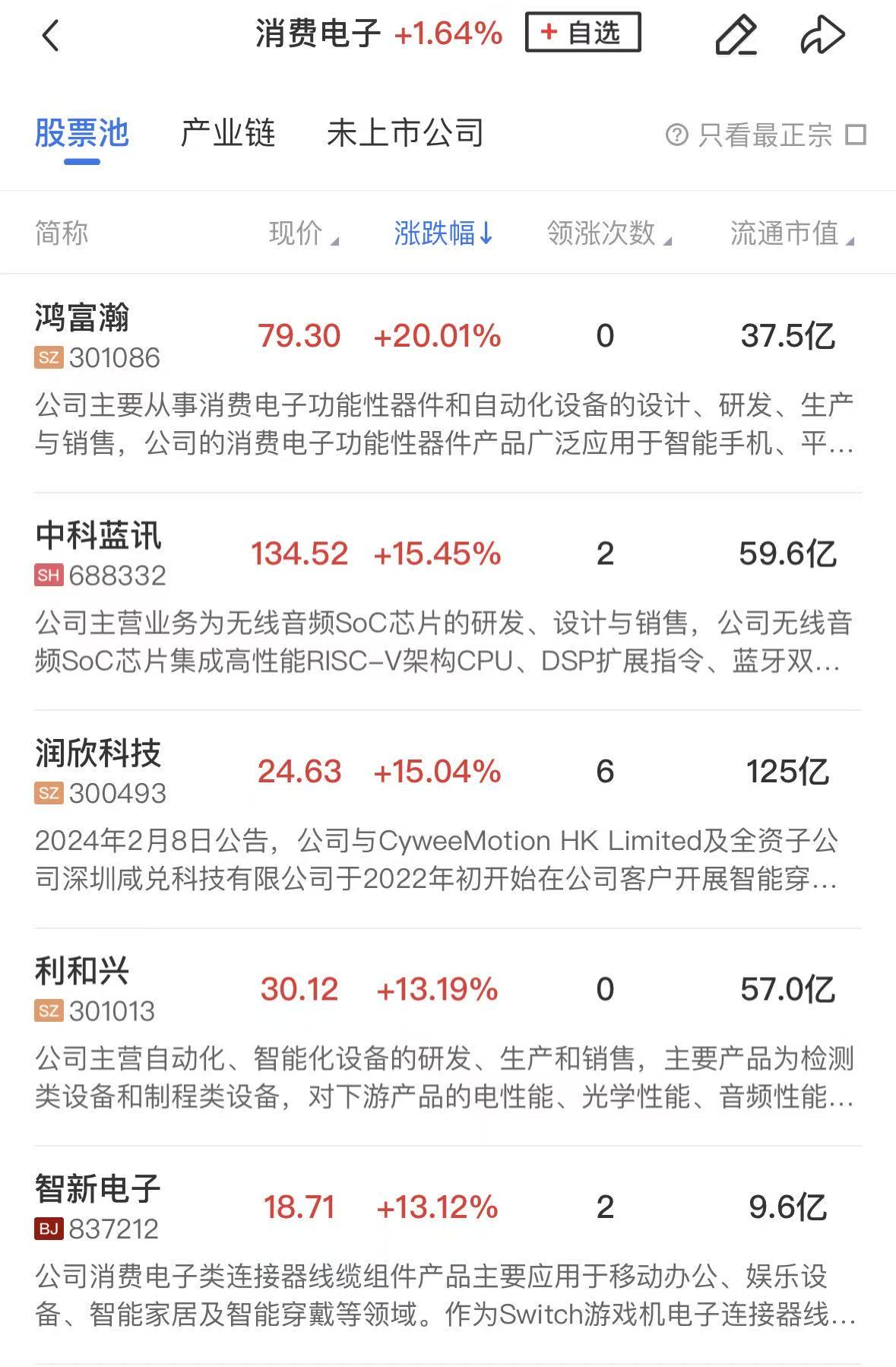 板块上,消费电子全线爆发,鸿富瀚、国光电器、盈趣科技、立讯精密涨停,显盈科技、工业富联、领益智造、歌尔股份涨幅居前。