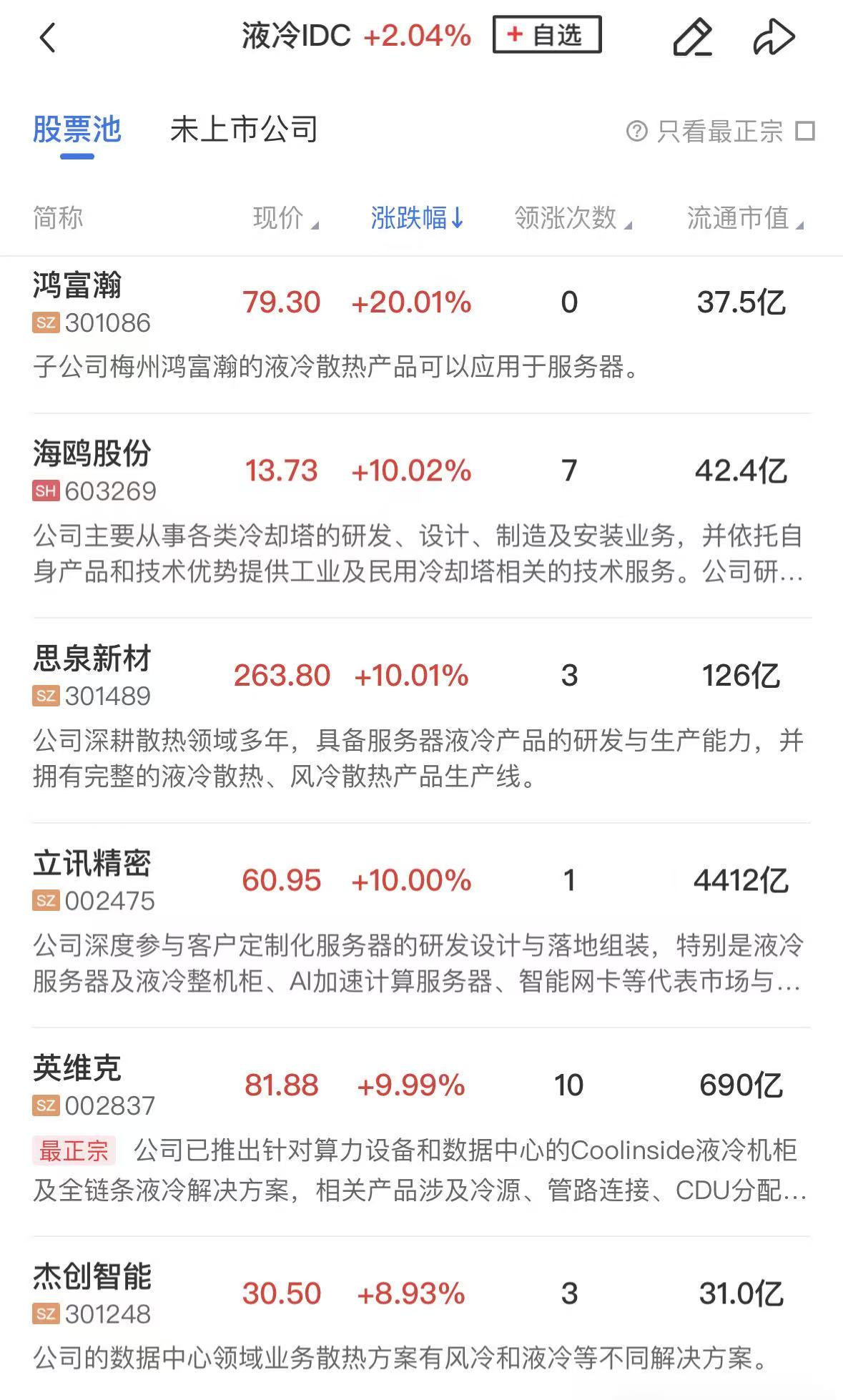 液冷服务器概念股再度走强, 工业富联涨超8%续创历史新高,思泉新材、海鸥股份、英维克涨停,利和兴、盾安环境、申菱环境涨幅居前。消息面上,2025AIDC产业发展大会期间,华为董事、ICT BG CEO杨超斌指出,随着AI算力规模与芯片功率的快速提升,液冷数据中心正成为AIDC的必然选择。