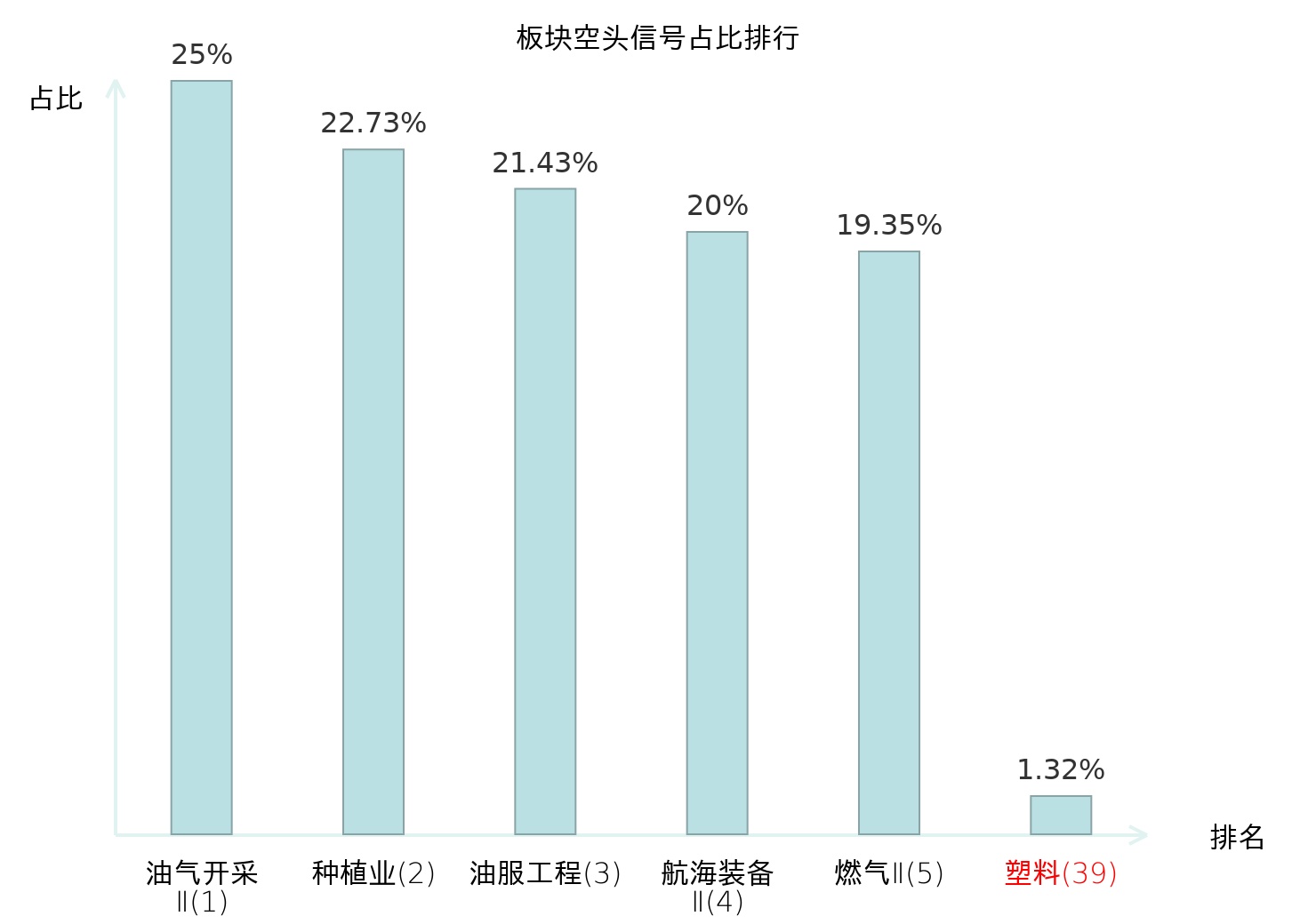 全市场所有行业板块中主力空头信号占比排名中,油气开采Ⅱ板块位居第一。专业工程板块名次提升最快,较昨日上升101位。