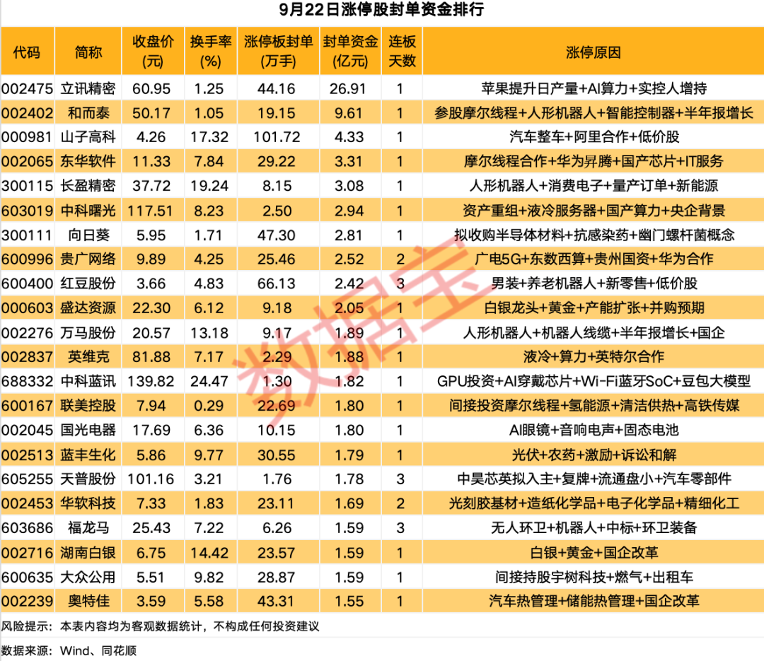 据证券时报·数据宝统计,今日(9月22日),从收盘涨停板封单量来看,山子高科遥遥领先,封单量高达101.72万手;红豆股份排名第二,封单量为66.13万手;向日葵、立讯精密、奥特佳、冠捷科技随后,封单量均在40万手以上。