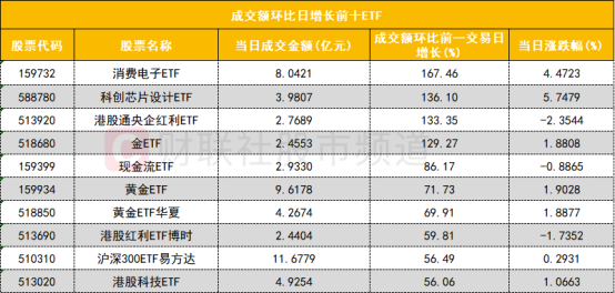 从成交额环比增长前十的ETF来看,消费电子ETF(159732)成交额环比增长167%位居首位;科创芯片设计ETF(588780)成交额环比增长136%位居次席。