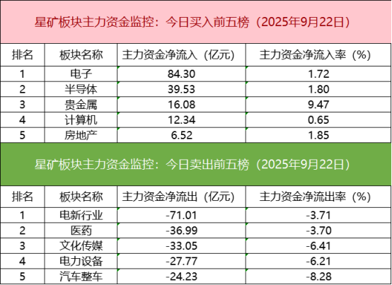 从主力板块资金监控数据来看,电子板块主力资金净流入居首。