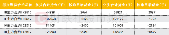 四大期指主力合约中,IF、IC、IM合约多空双方均减仓,IH合约多空双方均加仓,IM合约空头减仓数量较多。