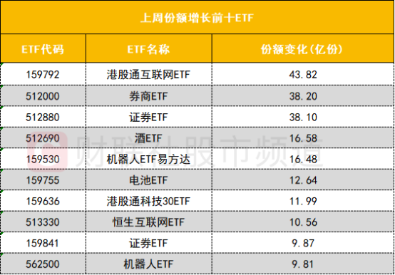 在上周份额增长前十ETF中,港股通互联网ETF(159792)上周份额增长43.82亿份位居首位;券商ETF(512000)上周份额增长38.20亿份位居次席。