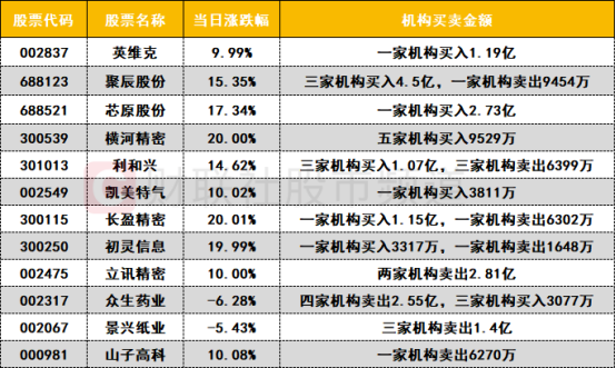 卖出方面,立讯精密遭两家机构席位合计卖出2.81亿。景兴纸业遭机构席位卖出1.4亿。