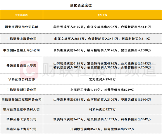 量化资金活跃度较高,凯美特气遭两家量化席位合计卖出1.2亿。合锻智能获两家量化席位买入1.04亿,而遭另一家量化席位卖出4141万。