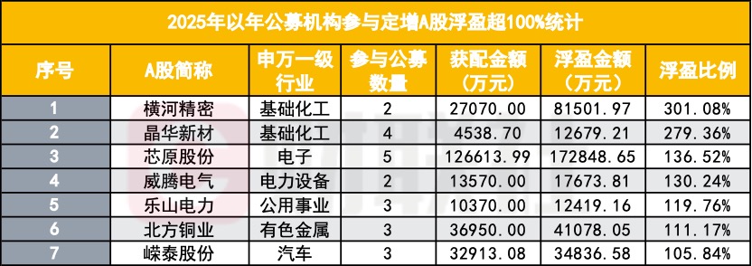 大体量项目中也不乏亮眼表现。芯原股份获5家公募机构定增参与,合计获配金额12.66亿元,目前浮盈金额为17.28亿元,浮盈比例达136.52%。AI赛道龙头寒武纪也吸引8家公募参与定增,尽管目前浮盈比例仅为19.62%,但合计浮盈金额已接近5亿元。这些数字不仅反映了资金的偏好,更显示出公募在行业趋势上的前瞻性布局。
