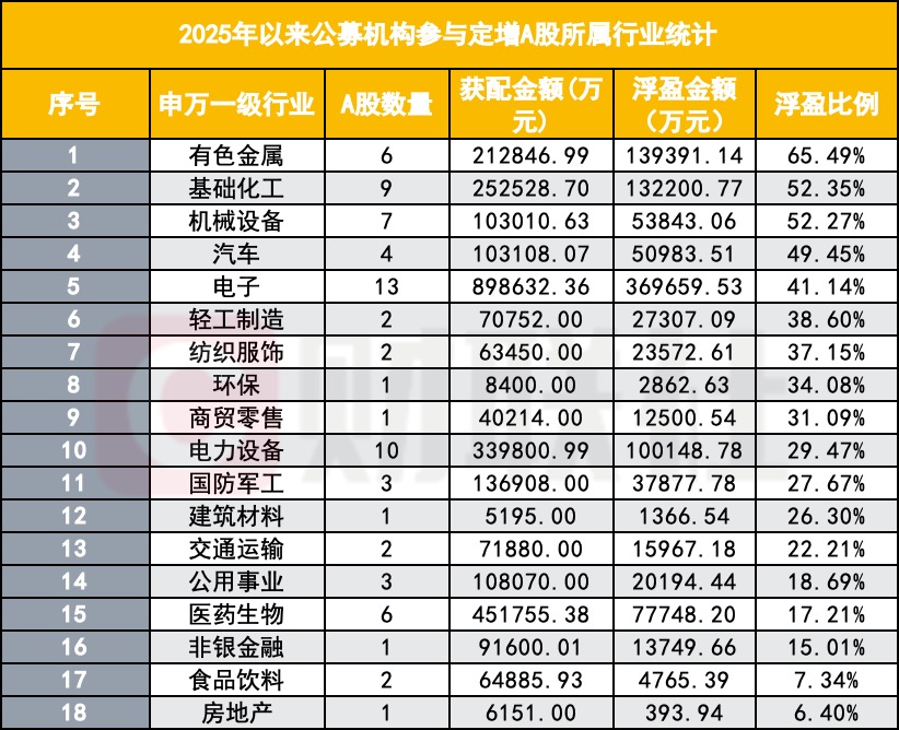 医药生物行业位列第二,参与个股包括百利天恒、迪哲医药等,合计获配45.18亿元,但受部分个股表现拖累,浮盈比例相对较低。此外,电力设备、基础化工、有色金属等行业也均获得超过10亿元的定增资金关注。