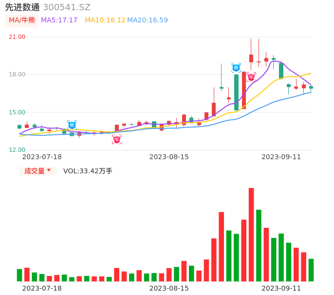 先进数通在8月30日出现日线级别牛点,60分钟级别还处于熊点区间,股价还处于强势震荡区间,注意上方筹码压力位:17.69元,如不能有效突破需要谨慎乐观。
