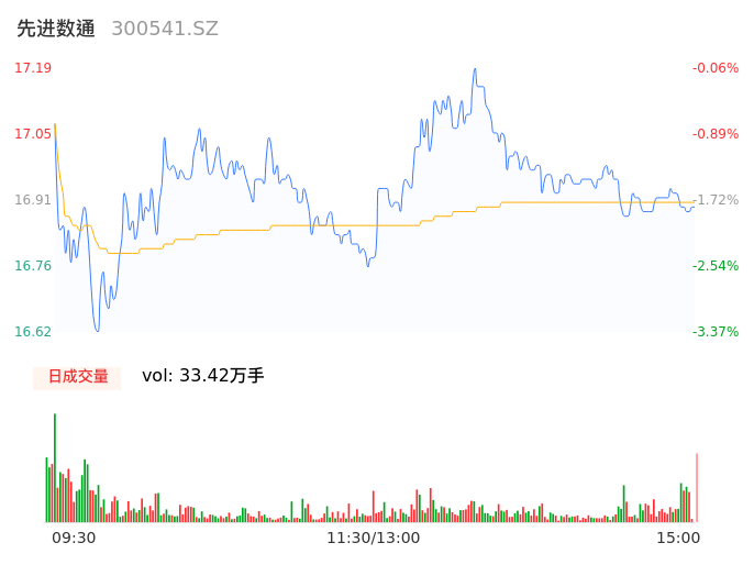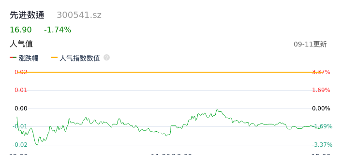 09月11日,先进数通收报16.90,股价涨幅-1.74%,成交金额5.65亿元,换手率13.07%。