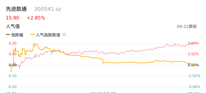 09月22日,先进数通收报15.90,股价涨幅2.85%,成交金额3.74亿元,换手率9.24%。