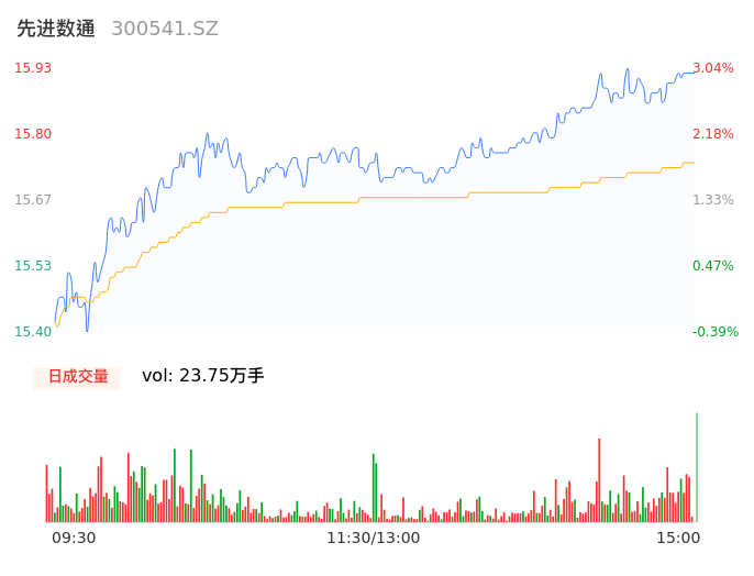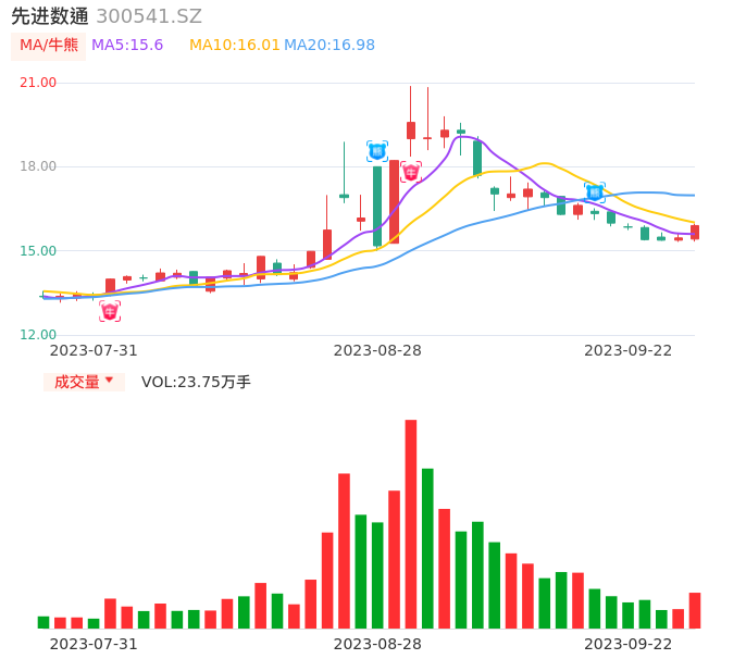09月22日,先进数通收报15.90,股价涨幅2.85%,成交金额3.74亿元,换手率9.24%。