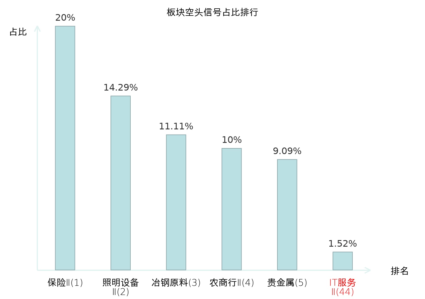 全市场所有行业板块中主力空头信号占比排名中,保险Ⅱ板块位居第一。医药商业板块名次提升最快,较昨日上升103位。