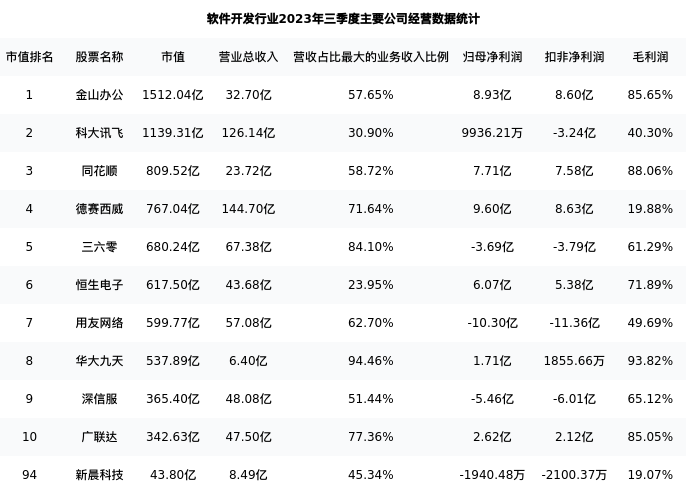 新晨科技最新报告期数据为三季度,下表汇总了软件开发行业内市值靠前的公司三季度主要经营数据