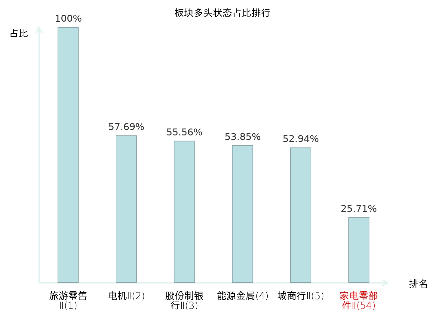 全市场所有行业板块中主力多头状态占比排名中,旅游零售Ⅱ板块位居第一。地面兵装Ⅱ板块名次提升最快,较昨日上升99位。