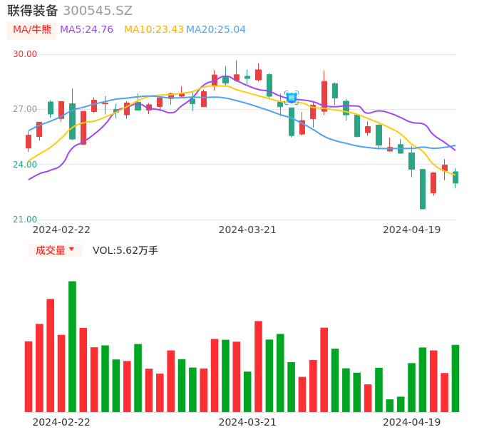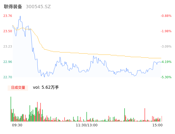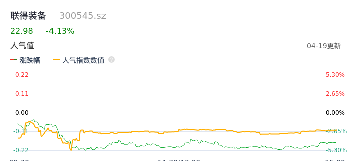 04月19日,联得装备收报22.98,股价涨幅-4.13%,成交金额1.30亿元,换手率5.02%。