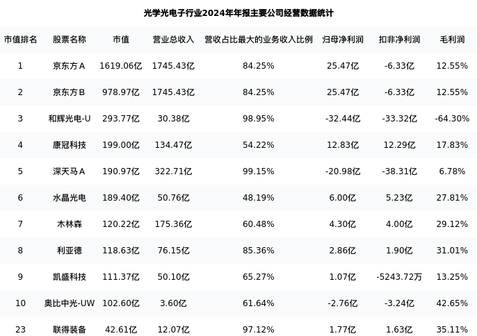 联得装备最新报告期数据为年报,下表汇总了光学光电子行业内市值靠前的公司年报主要经营数据