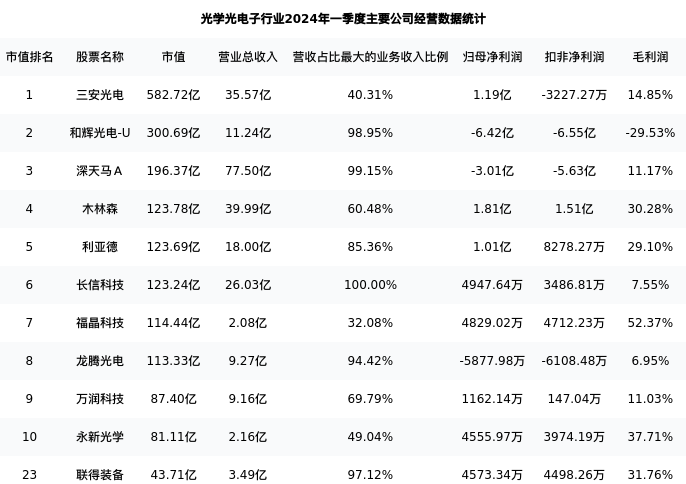 联得装备最新报告期数据为一季度,下表汇总了光学光电子行业内市值靠前的公司一季度主要经营数据
