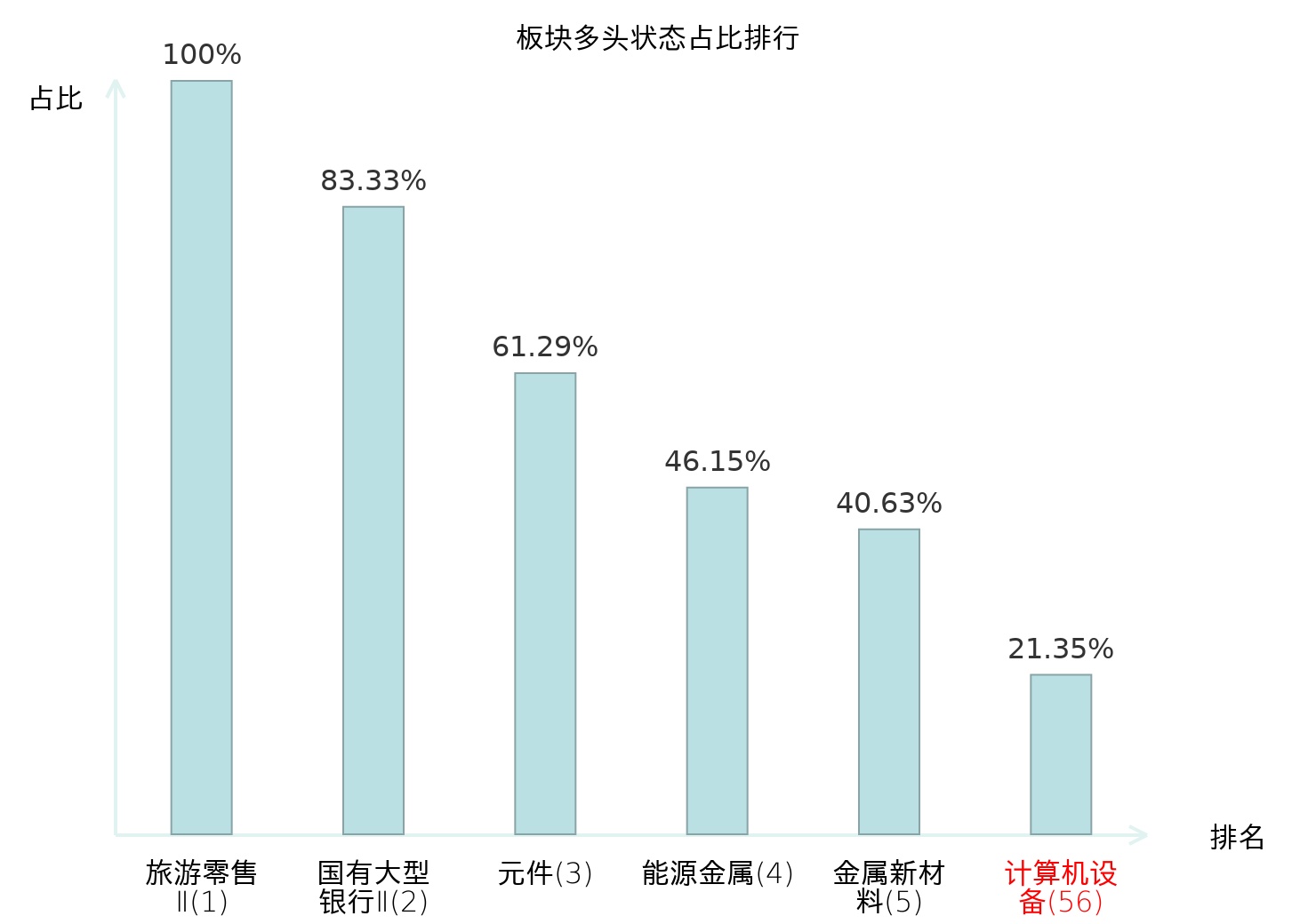 全市场所有行业板块中主力多头状态占比排名中,旅游零售Ⅱ板块位居第一。数字媒体板块名次提升最快,较昨日上升67位。