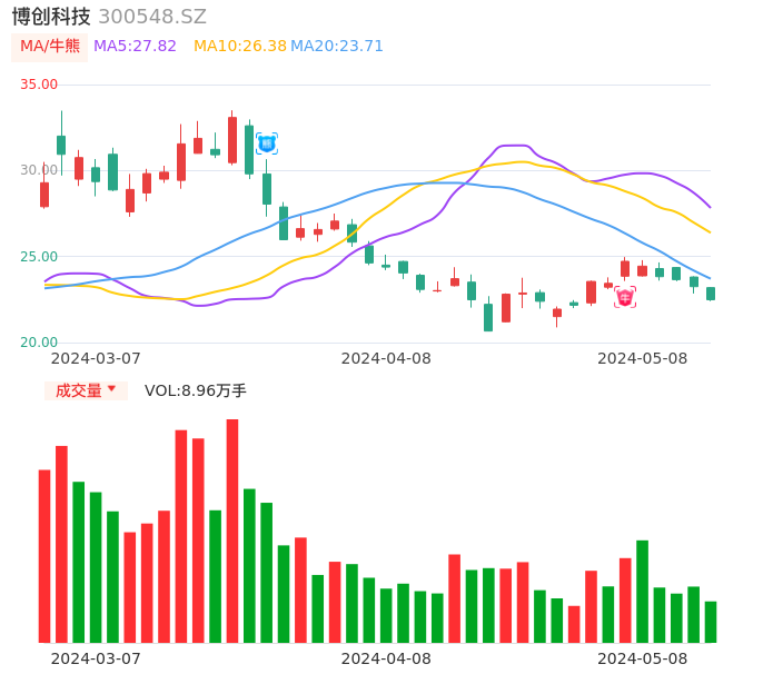 05月08日,博创科技收报22.49,股价涨幅-3.27%,成交金额2.03亿元,换手率4.03%。