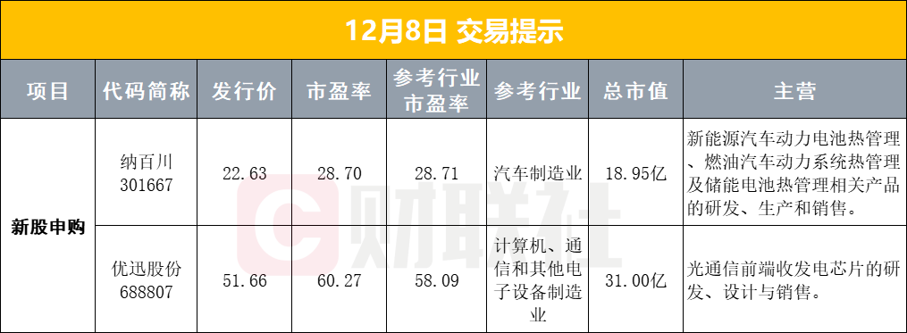 5、古鳌科技公告,公司实际控制人筹划控制权变更事项,股票自12月8日开市起停牌,预计停牌时间不超过2个交易日。