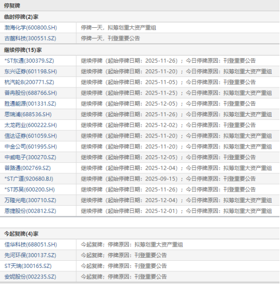 上证报中国证券网讯 12月8日,2家公司临停:渤海化学、古鳌科技,4家公司复牌:佳华科技、先河环保、ST天瑞、安妮股份。