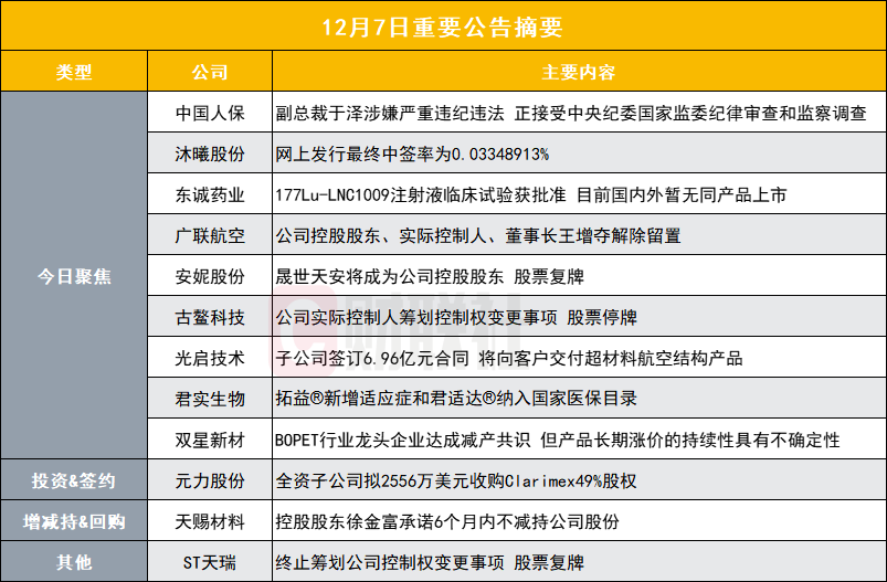 中国人保(601319.SH)公告称,根据中央纪委国家监委网站于2025年12月6日所披露的消息,中国人民保险集团股份有限公司(“本公司”)副总裁于泽涉嫌严重违纪违法,目前正接受中央纪委国家监委纪律审查和监察调查。该事项不影响本公司经营管理。