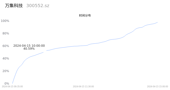 300552万集科技2024年04月15日成交12.72万手,成交金额3.01亿元,相较昨日放量1.23万手,换手率10.11%,成交活跃。