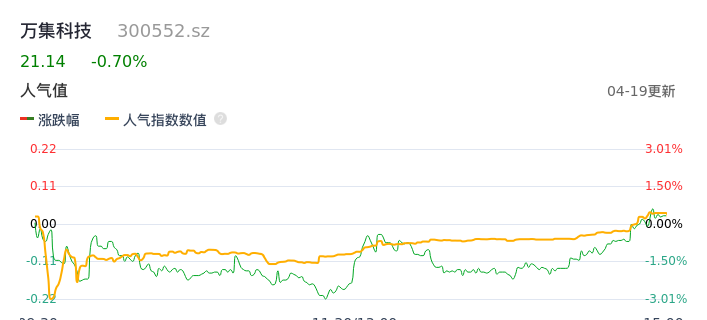 04月19日,万集科技收报21.14,股价涨幅-0.70%,成交金额1.88亿元,换手率7.12%。