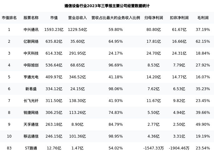 ST路通最新报告期数据为三季报,下表汇总了通信设备行业内市值靠前的公司三季报主要经营数据