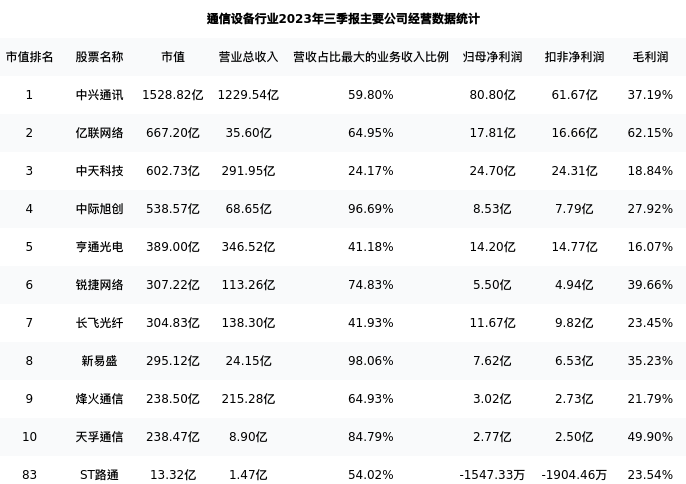 ST路通最新报告期数据为三季报,下表汇总了通信设备行业内市值靠前的公司三季报主要经营数据