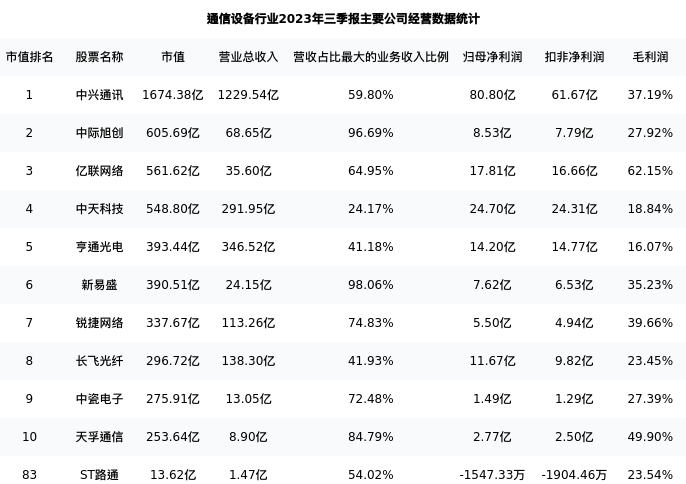 ST路通最新报告期数据为三季报,下表汇总了通信设备行业内市值靠前的公司三季报主要经营数据