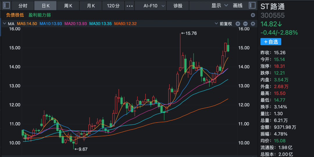 截至目前,ST路通股价为14.82元/股,总市值接近30亿元。