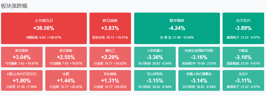 盘面上,磷化工概念股震荡走强,川金诺、湖北宜化、中毅达、新农股份涨停。光伏概念股局部反弹,清源股份4连板,三峡新材涨停。水利、环保股午后异动,联合水务、海天股份涨停。MR概念股走势分化,双象股份涨停,丝路视觉一度涨超10%。龙字辈个股继续活跃,龙洲股份、龙星化工等涨停。下跌方面,数据要素概念股集体调整,深桑达A跌停。板块方面,磷化工、PEEK材料、贵金属、环保等板块涨幅居前,CPO、数据要素、多模态、存储芯片等板块跌幅居前。