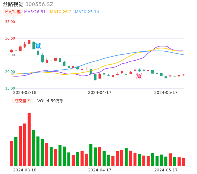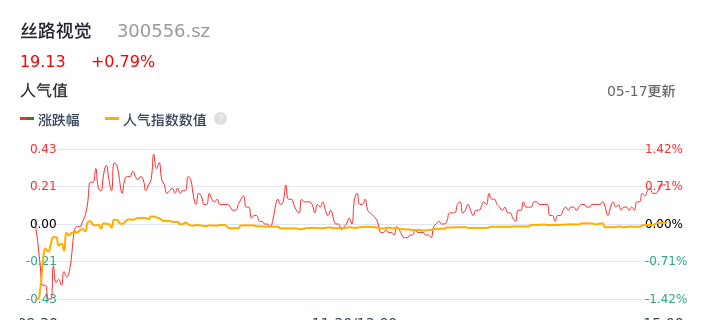 05月17日,丝路视觉收报19.13,股价涨幅0.79%,成交金额8729.25万元,换手率4.46%。