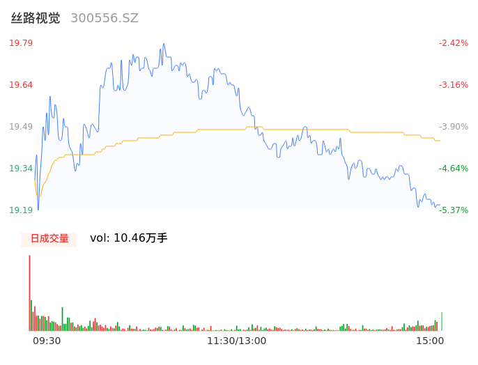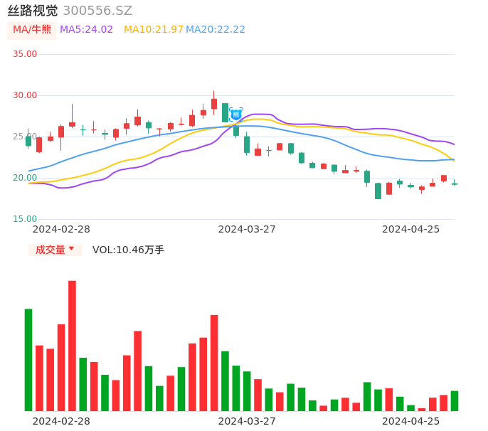 04月25日,丝路视觉收报19.20,股价涨幅-5.33%,成交金额2.03亿元,换手率10.17%。